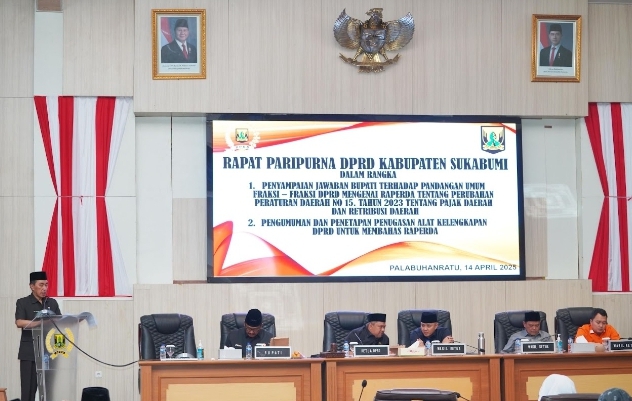 Sukabumi,JuangTv.Com-Rapat Paripurna ke-12 DPRD Kabupaten Sukabumi, yang digelar Senin (14/4/2025), menghasilkan jawaban resmi Bupati Sukabumi, Drs. H. Asep Japar, MM, terhadap pandangan umum fraksi-fraksi DPRD terkait Rancangan Peraturan Daerah (Raperda) tentang Perubahan Peraturan Daerah Nomor 15 Tahun 2023 tentang Pajak Daerah dan Retribusi Daerah. Rapat yang dipimpin Ketua DPRD Budi Azhar Mutawali, S.IP., ini dihadiri oleh seluruh jajaran pimpinan DPRD, unsur Forkopimda, kepala perangkat daerah, camat se-Kabupaten Sukabumi, dan tamu undangan.
