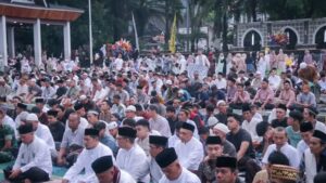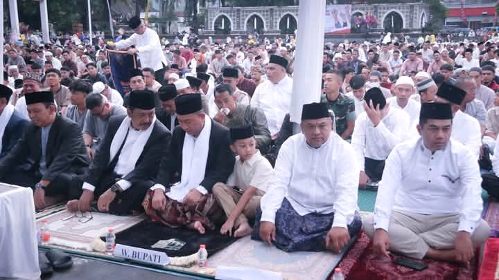 Sukabumi,JuangTv.Com-Suasana khidmat dan penuh persaudaraan menyelimuti Masjid Agung Palabuhanratu pada Senin (31/3/2025), saat ribuan warga Sukabumi melaksanakan Shalat Idul Fitri 1446 H/2025 M. Kehadiran Bupati Sukabumi, H. Asep Japar, beserta Wakil Bupati H. Andreas dan unsur Forkopimda semakin menambah semarak pelaksanaan ibadah yang diimami oleh KH. Useh Ahmad Achwasy dan diisi khotbah oleh KH. Aang Abdullah Zein ini.